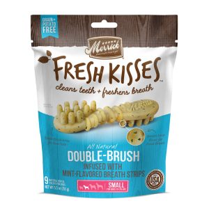 For his optimal dental health and fresh breath, I purchased these Fresh Kisses Mint Strips Small Dog Treats to ensure I can safely kiss and pet him without any concerns.